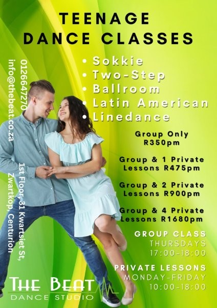 We have one 60-minute group class per week for our teenage students as well as private lessons to be taken before 18h30. We teach Ballroom, Latin American, Sokkie and Line Dancing during these lessons.